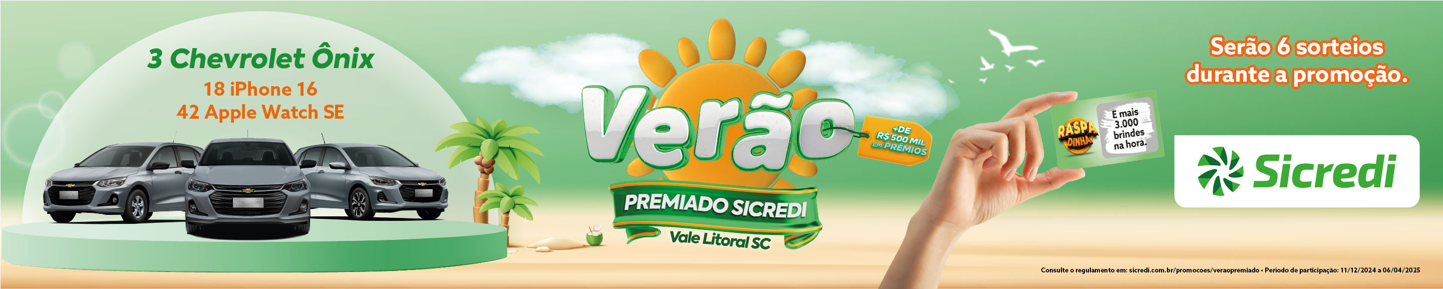 CERTIFICADO DE AUTORIZAÇÃO SEAE/MF nº 04.038409/2024. Fundos de investimento não contam com a garantia do administrador do fundo, do gestor da carteira, de qualquer mecanismo de seguro ou, ainda, do Fundo Garantidor de Fundos de Investimento - FGC. A rentabilidade obtida no passado não representa garantia de rentabilidade futura. É recomendada a leitura cuidadosa do prospecto e do regulamento do fundo de investimento pelo investidor ao aplicar os seus recursos. e Previdência Privada Intermediados por Corretora de Sicredi Ltda., CNPJ 04.026.752/0001-82, registro SUSEP n° 10.0412376. Os planos em PGBL e VGBL são administrados pelo Banco Cooperativo Sicredi S.A., CNPJ 01.181.521/0001-55. Produtos de Fundos de Investimento: a disponibilidade está condicionada à análise de Fundos de Investimento do associado. Este produto/serviço pode não estar disponível para associados conta Woop Sicredi. Contate o atendimento no seu app para maiores informações. Promoção válida durante o período de 11/12/24 a 06/04/25, para os associados da cooperativa Sicredi Vale do Itajaí e Litoral Catarinense. Consulte o regulamento completo da promoção e condições de contratação nas unidades de atendimento participantes e no site sicredi.com.br/promocoes. Imagens meramente ilustrativas. SAC - 0800 724 7220 / Deficientes Auditivos ou de Fala - 0800 724 0525. Ouvidoria - 0800 646 2519.