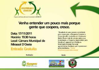 A cooperativa Sicredi Sudoeste MT apresentou para a população de Mirassol do Oeste o programa Cooperar e Crescer, programa de desenvolvimento sustentável do Sicredi, que tem por objetivo estabelecer um ambiente propicio para o surgimento de empresas e agroindústrias e com isso fazer crescer o setor econômico de forma sustentável através da geração de empregos, renda, agregando valor e qualidade a produção local.